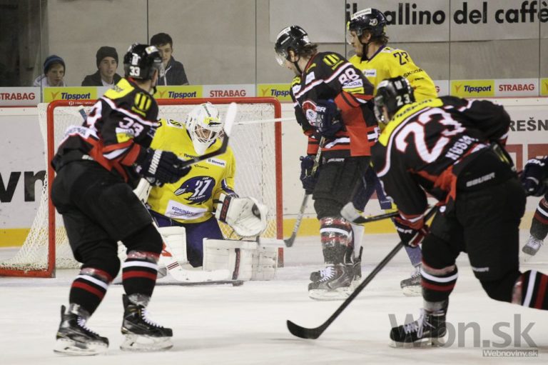 Útočník Marcel Holovič (vľavo) z ŠHK Piešťany strieľa na bránku Banskej Bystrice počas zápasu 22. kola Tipsport extraligy. Banská Bystrica, 14. november 2014. Foto: SITA/Ján Viazanička