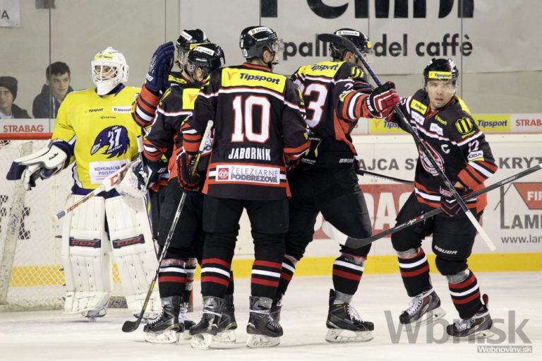 Hokejisti Banskej Bystrice sa tešia z gólu v sieti brankára ŠHK 37 Piešťany Martina Šureka počas zápasu 22. kola Tipsport extraligy. Banská Bystrica, 14. november 2014. Foto: SITA/Ján Viazanička