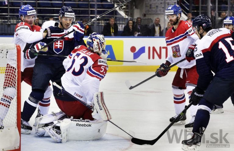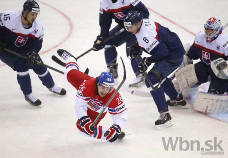 Richard Pánik (vľavo) zo Slovenska a Ján Kolář (vpravo) z Česka počas zápasu Slovensko - Česko základnej skupiny Majstrovstiev sveta v ľadovom hokeji 2014 v Minsku. Bielorusko, Minsk, 9. máj 2014. Foto: SITA/Ján Viazanička