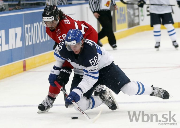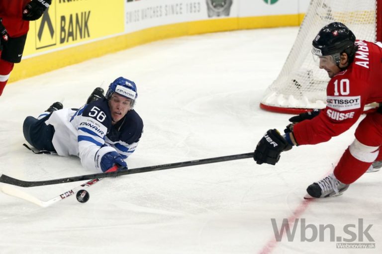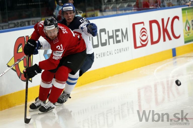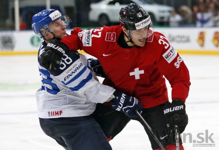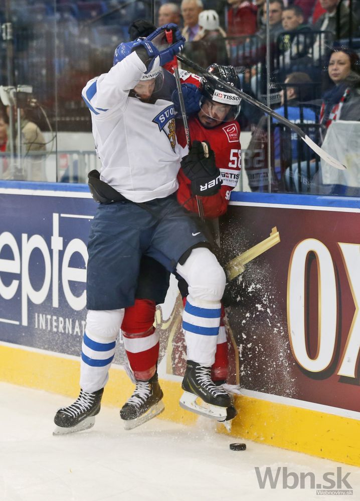 Fínsky útočník Jere Sallinen v súboji so Švajčiarom Thomasom Rufenachtom počas piatkového zápasu na MS v hokeji. Foto: SITA/AP