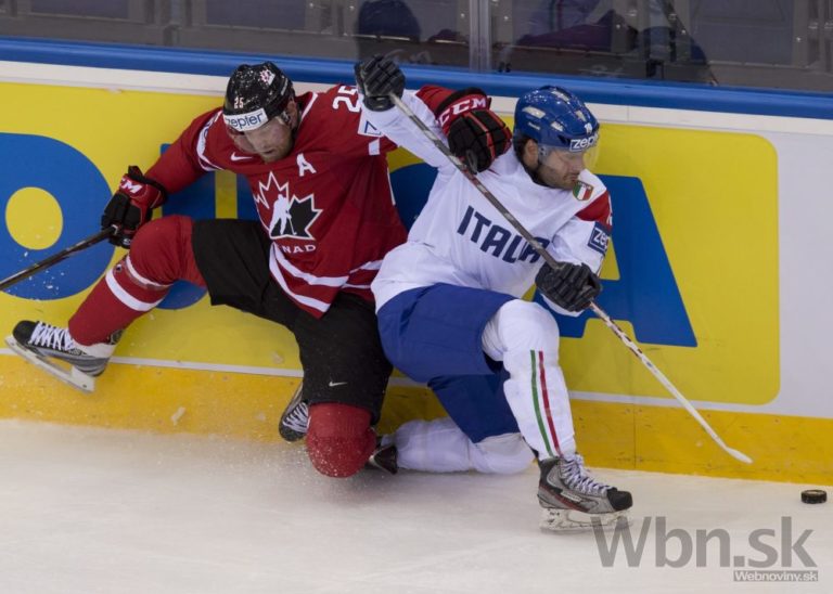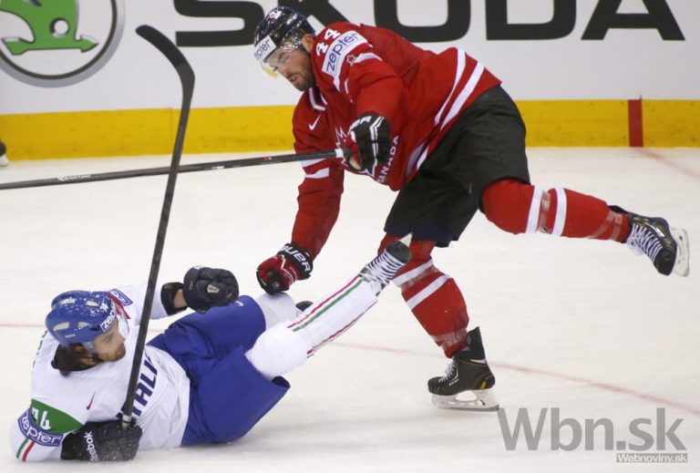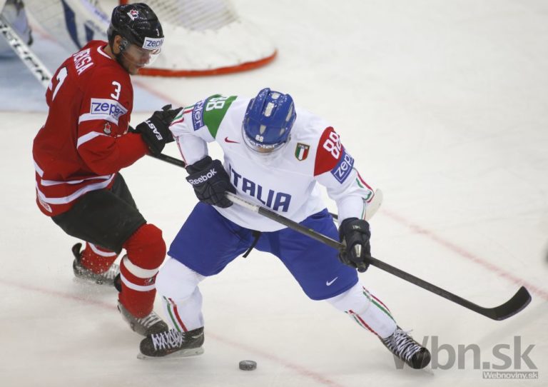 Talian Luca Felicetti v súboji s kanadským obrancom Kevinom Bieksom počas piatkového zápasu na MS v hokeji. Foto: SITA/AP
