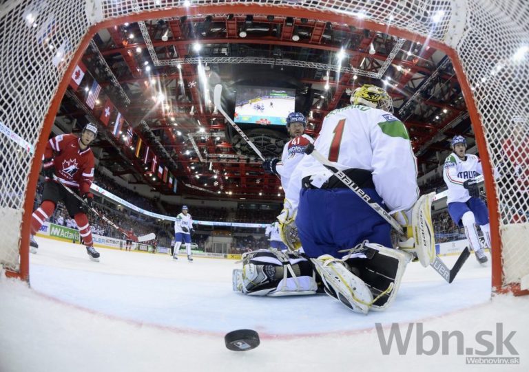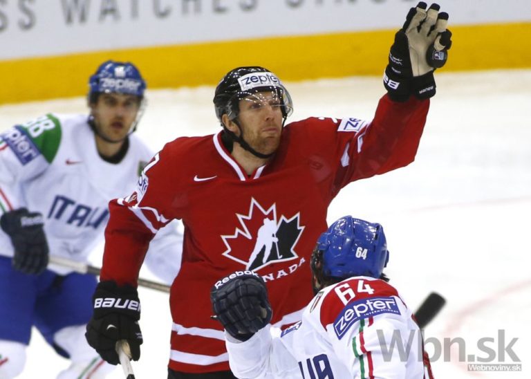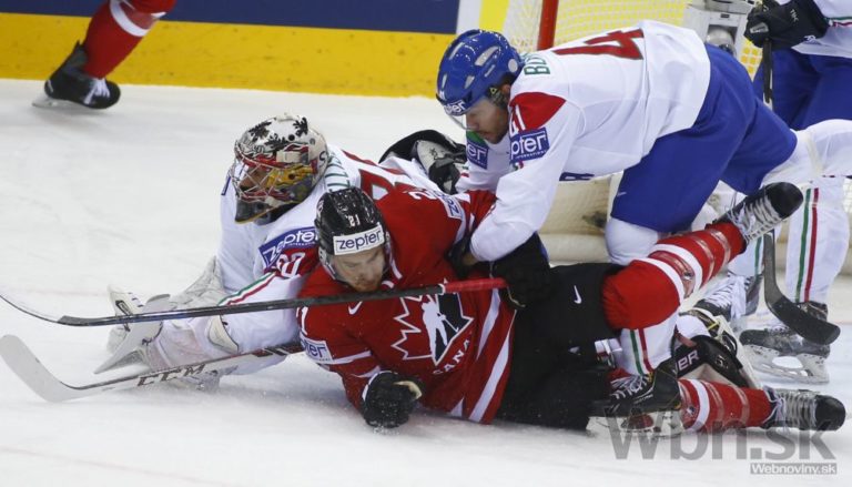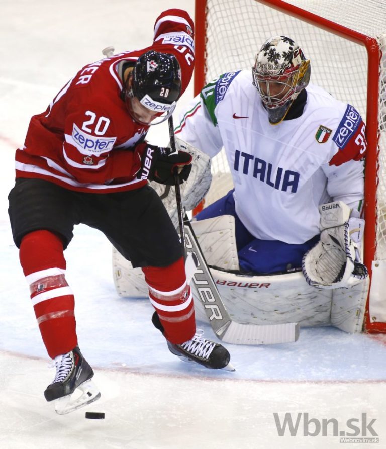 Kanadský útočník Troy Brouwer sa snaží prekonať talianskeho brankára Daniela Bellissima počas piatkového zápasu na MS v hokeji. Foto: SITA/AP