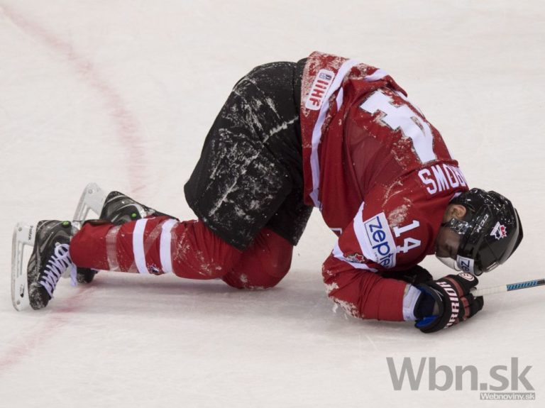 Otrasený kanadský útočník Alex Burrows po zrážke s Talianom Joachimom Ramoserom počas piatkového zápasu na MS v hokeji. Foto: SITA/AP