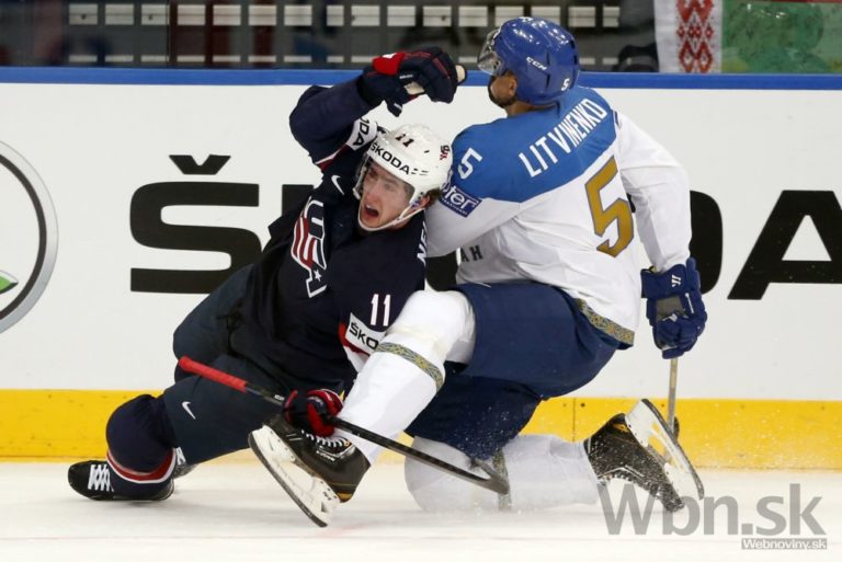 Americký útočník Brock Nelson v súboji s Kazachom Alexejom Litvinenkom počas piatkového zápasu na MS v hokeji. Foto: SITA/AP