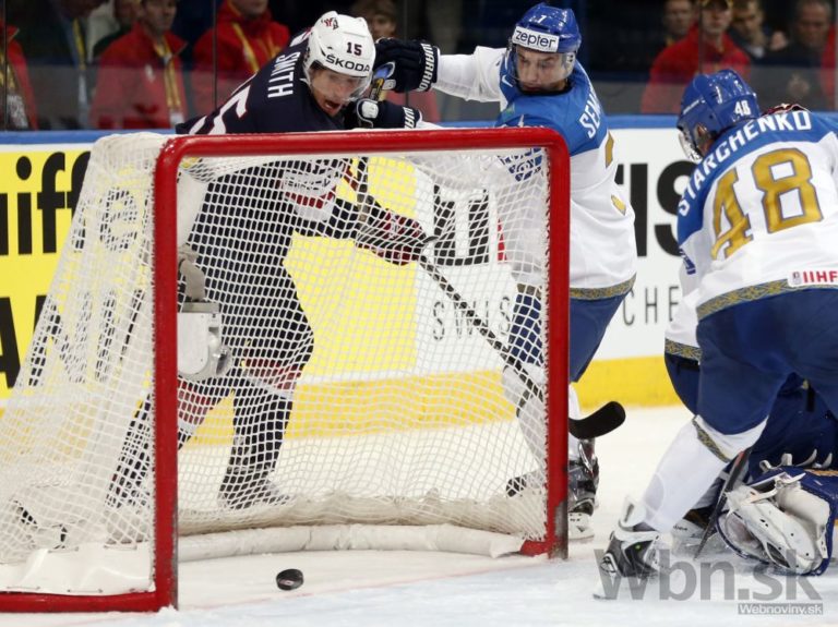 Americký útočník Craig Smith strieľa gól Kazachom počas piatkového zápasu na MS v hokeji. Foto: SITA/AP