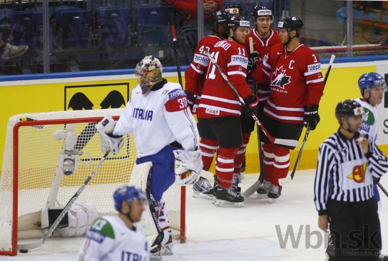 Radosť kanadských hokejistov po góle Joeal Warda v sieti Talianska počas piatkového zápasu na MS v hokeji. Foto: SITA/AP