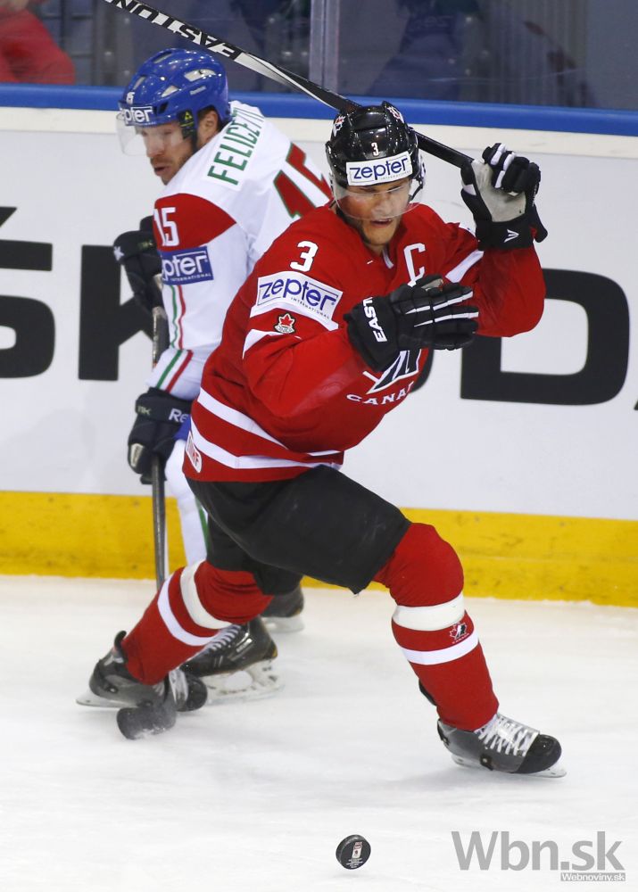 Kanaďan Braydon Coburn v súboji s Talianom Brianom Ihnacakom počas piatkového zápasu na MS v hokeji. Foto: SITA/AP