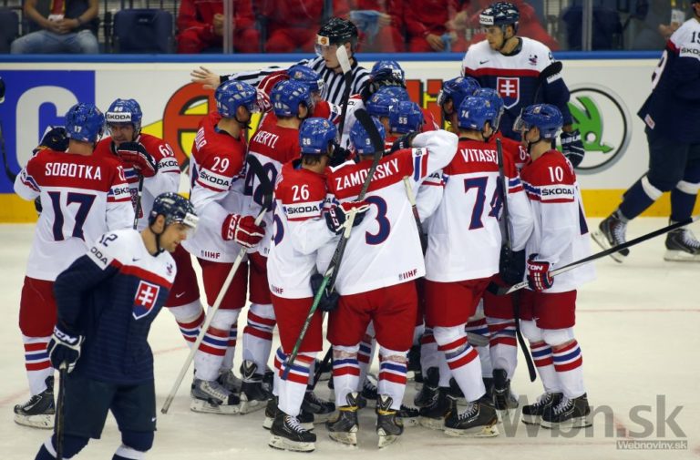 Radosť českých hokejistov počas zápasu MS v Minsku proti Slovensku. Foto: SITA/AP