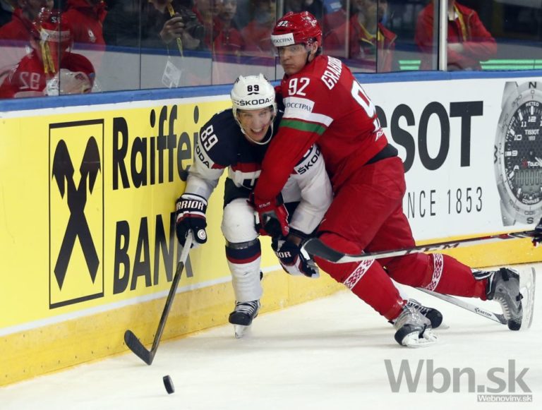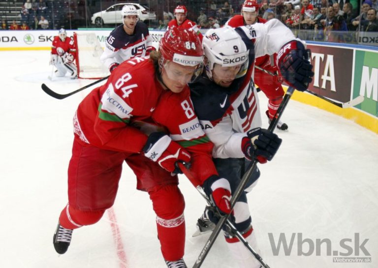 Hráč Bieloruska Michali Grabovský (vľavo) v súboji s Tylerom Johnsonom z USA počas zápasu MS v Minsku. Foto: SITA/AP