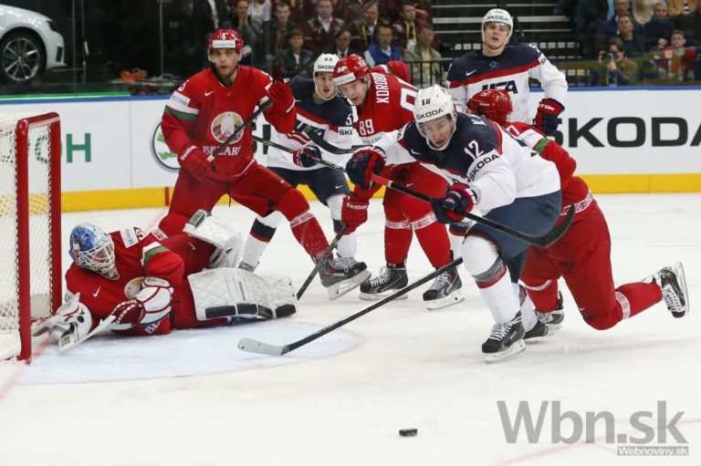Závar pred bránou Bielourska v zápase proti USA na MS v Minsku. Foto: SITA/AP