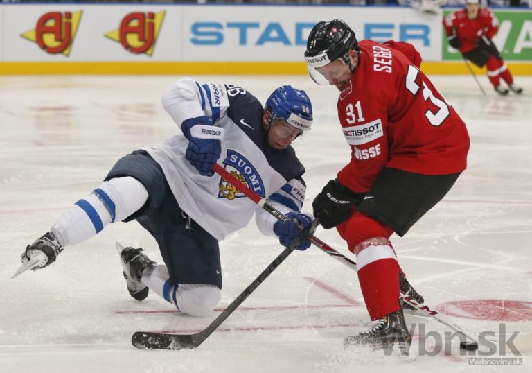 Fínsky útočník Erik Haula v súboji so švajčiarskym obrancom Mathiasom Segerom počas piatkového zápasu na MS v hokeji. Foto: SITA/AP