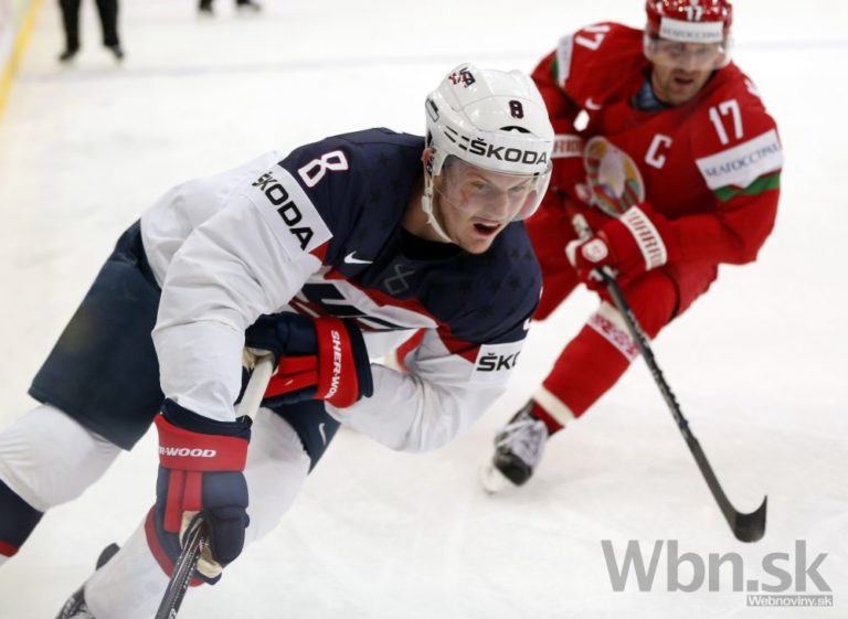 Hráč USA Jacob Trouba (vľavo) a kapitán Bieloruska Michail Grabovský počas zápasu MS v Minsku. Foto: SITA/AP