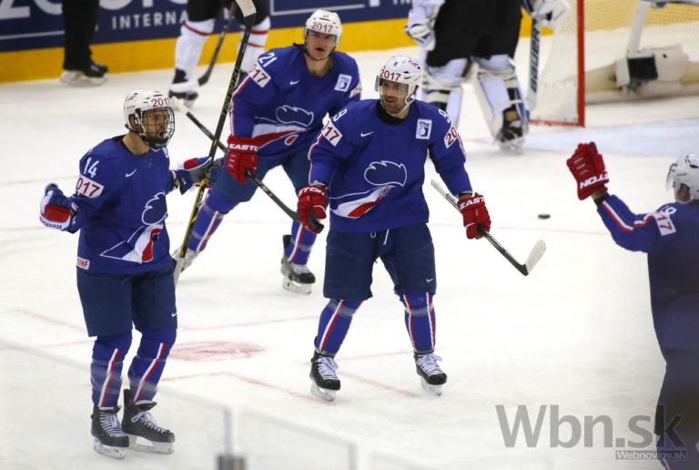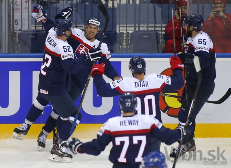 Radosť slovenských hokejistov po góle v sieti česka počas zápasu MS v Minsku. Foto: SITA/AP