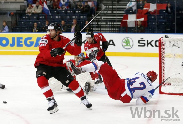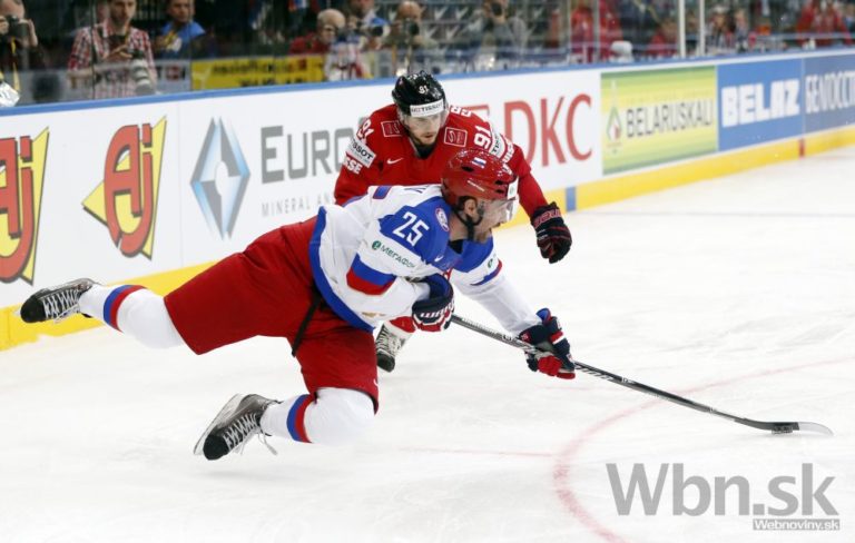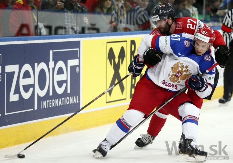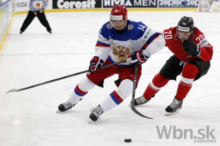 Zľava: Švajčiar Kevin Romy v súboji s ruským útočníkom Arťomom Anisimovom počas piatkového zápasu na svetovom šampionáte. Foto: SITA/AP