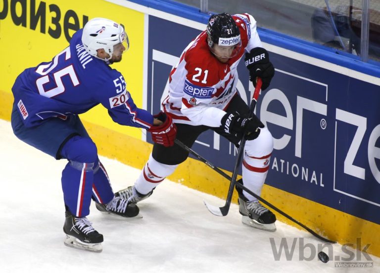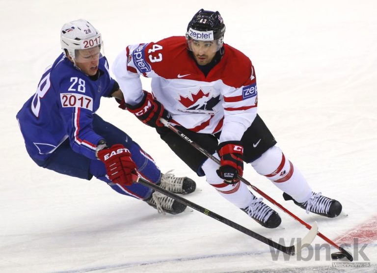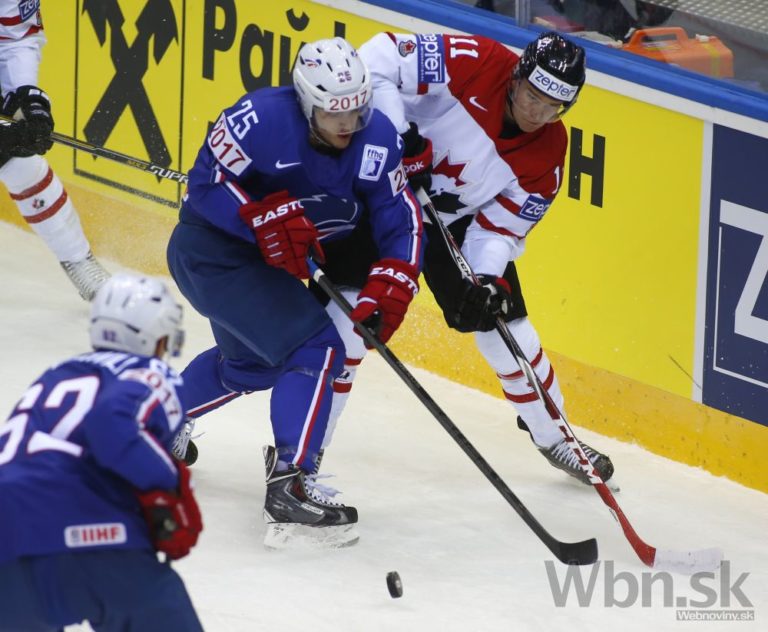 Zľava: Francúz Damien Raux v súboji s kanadským útočníkom Nazemom Kardim počasi piatkového zápasu na MS v hokeji. Foto: SITA/AP
