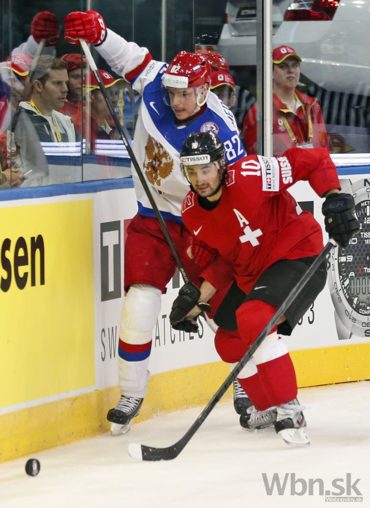 Zľava: Ruský útočník Vadim Šipačov a Švajčiar Victor Stanescu počas piatkového zápasu na MS v hokeji. Foto: SITA/AP