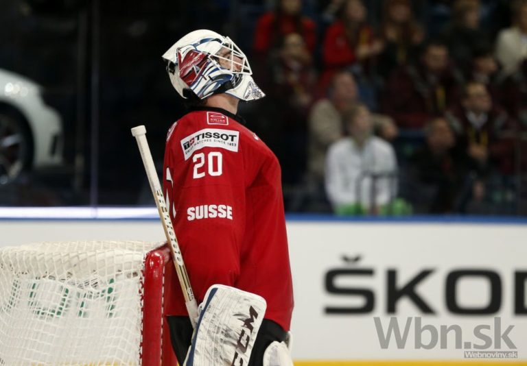 Švajčiarsky brankár Reta Berra počas piatkového zápasu proti Fínsku na MS v hokeji. Foto: SITA/AP