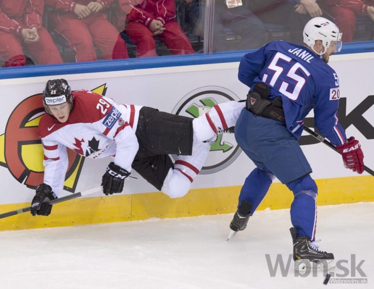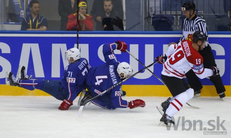 Zľava: Kanadský útočník Nathan MacKinnon a Francúz Jonathan Janil počas piatkového zápasu na MS v hokeji. Foto: SITA/AP