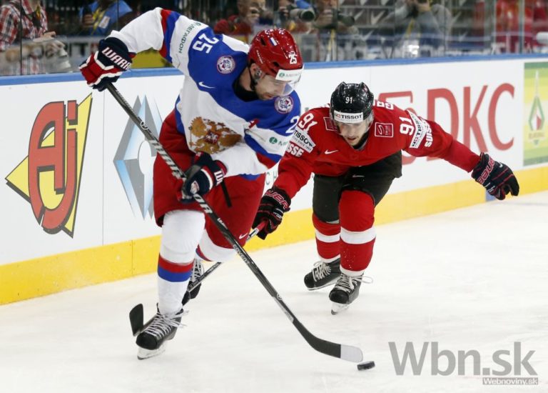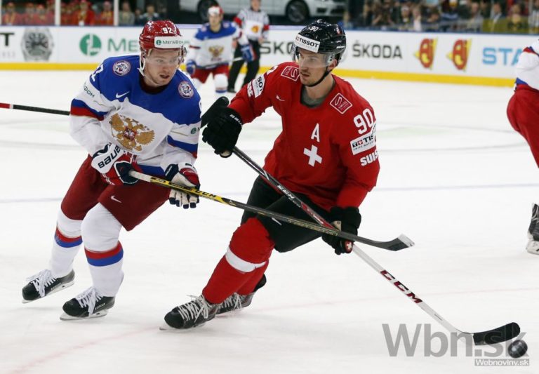 Zľava: Švajčiar Mathias Seger v súboji s Rusom Jevgenijom Dadonovom počas piatkového zápasu na MS v hokeji. Foto: SITA/AP