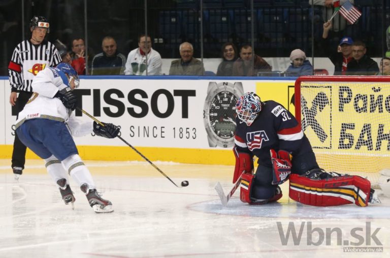 Kazašský útočník Konstantin Romanov neprekonal amerického brankára Tima Thomasa počas piatkového zápasu na MS v hokeji. Foto: SITA/AP