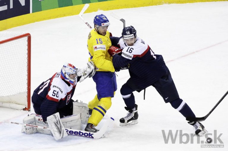 Švédsky útočník Joakim Lindström v súboji so slovenským obrancom Ivanom Švarným pred brankárom Jánom Lacom počas piatkového zápasu na MS v hokeji. Foto: SITA/AP