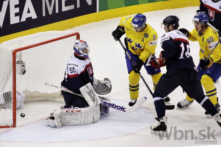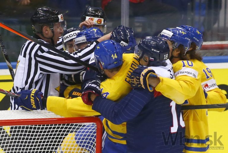 Súboj švédskych a slovenských hokejistov počas piatkového zápasu na svetovom šampionáte v Minsku. Foto: SITA/AP