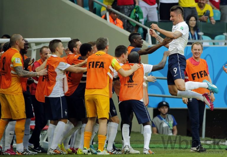 Francúz Olivier Giroud sa spolu s tímom raduje z otváracieho gólu v zápase E-skupiny medzi Švajčiarskom a Francúzskom v aréne Fonte Nova. Piatkové duely na XX. majstrovstvách sveta vo futbale v Brazílii. Foto: SITA/AP