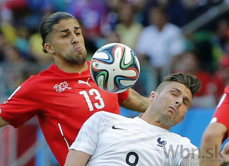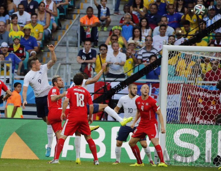Francúz Olivier Giroud otvára skóre počas zápasu E-skupiny medzi Švajčiarskom a Francúzskom v aréne Fonte Nova. Piatkové duely na XX. majstrovstvách sveta vo futbale v Brazílii. Foto: SITA/AP