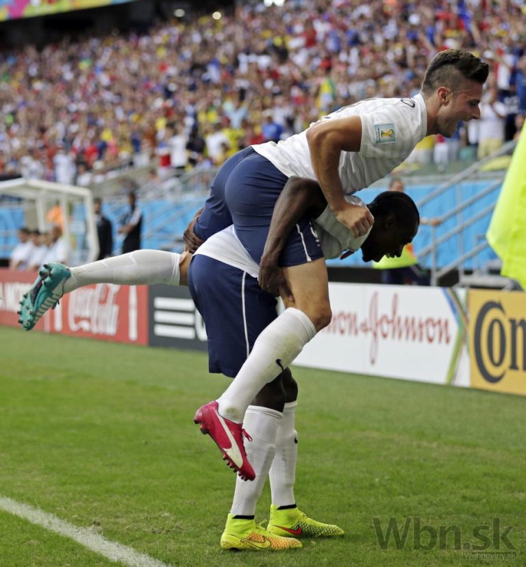Francúzi sa tešia zo svojho druhého gólu počas zápasu E-skupiny medzi Švajčiarskom a Francúzskom v aréne Fonte Nova. Piatkové duely na XX. majstrovstvách sveta vo futbale v Brazílii. Foto: SITA/AP