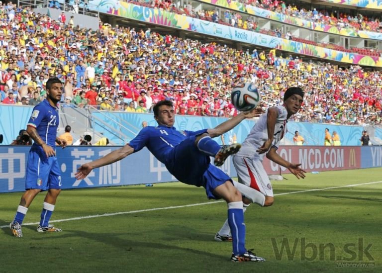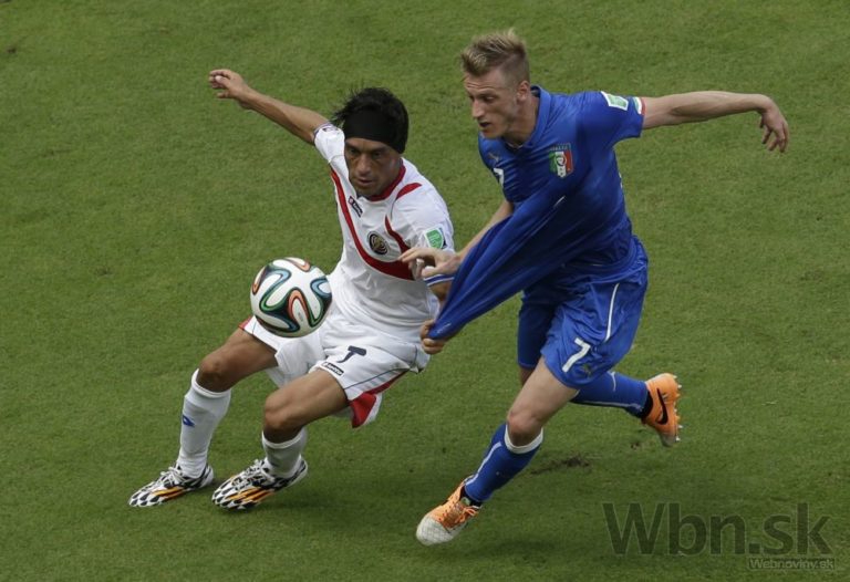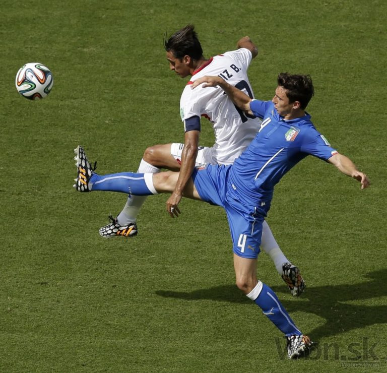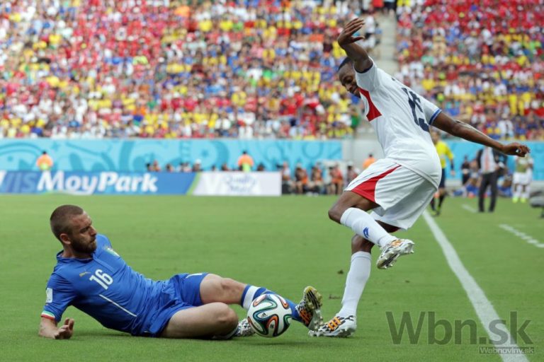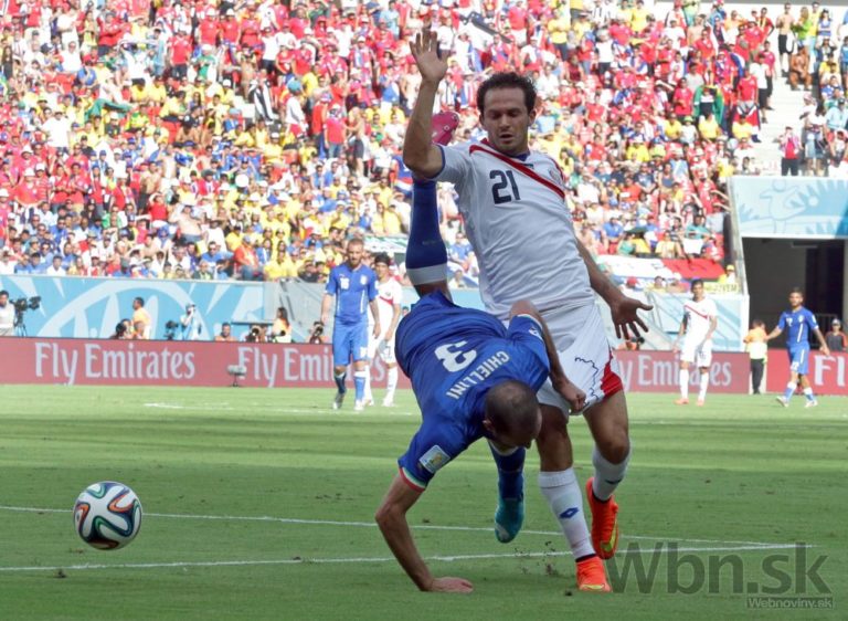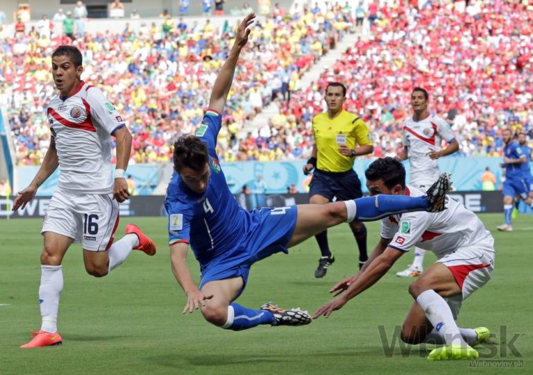 Taliansky futbalista Matteo Darmian padá po zákroku Kostaričana Giancarla Gonzaleza počas piatkového zápasu D-skupiny na svetovom šampionáte v Brazílii. Foto: SITA/AP