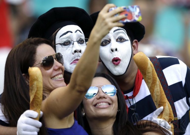 Francúzski fanúšici pózujú pred zápasom E-skupiny medzi Švajčiarskom a Francúzskom v aréne Fonte Nova. Piatkové duely na XX. majstrovstvách sveta vo futbale v Brazílii. Foto: SITA/AP