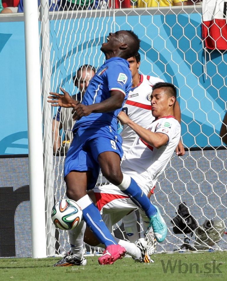 Taliansky futbalista Mario Balotelli v hlavičkovom súboji s Kostaričanom Giancarlom Gonzalezom počas piatkového zápasu D-skupiny na svetovom šampionáte v Brazílii. Foto: SITA/AP