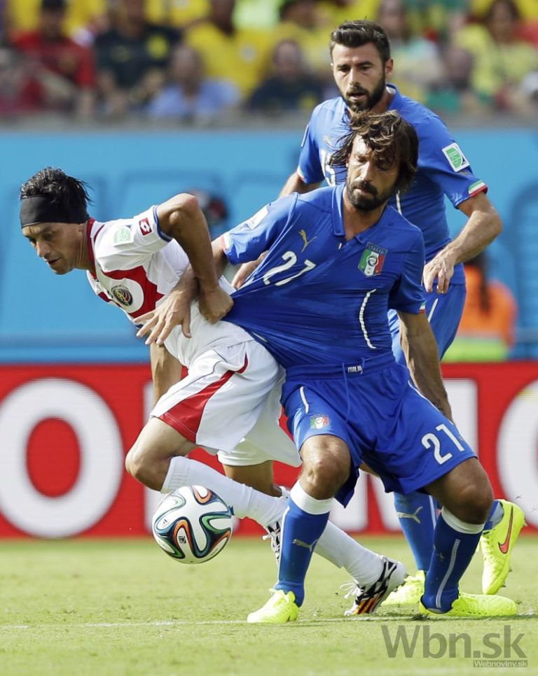 Hráč Kostariky Christian Bolanos drží za tričko talianskeho hráča Ignazio Abate počas zápasu D-skupiny medzi Kostarikou a Talianskom na štadióne Arena Pernambuco v Recife. Piatkové duely na XX. majstrovstvách sveta vo futbale v Brazílii. Foto: SITA/AP