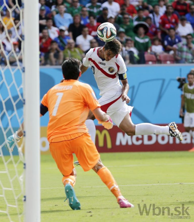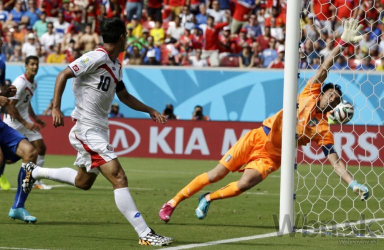 Hráč Kostariky Bryan Ruiz sleduje ako lopta prechádza okolo talianskeho brankára. Prvý gól v zápase D-skupiny medzi Kostarikou a Talianskom na štadióne Arena Pernambuco v Recife. Piatkové duely na XX. majstrovstvách sveta vo futbale v Brazílii. Foto: SITA/AP