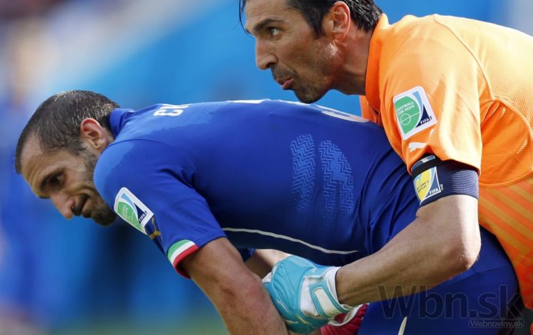 Taliansky brankár Gianluigi Buffon drží svojho spoluhráča Giorgia Chielliniho počas piatkového zápasu D-skupiny medzi Kostarikou a Talianskom. Piatkové duely na XX. majstrovstvách sveta vo futbale v Brazílii. Foto: SITA/AP