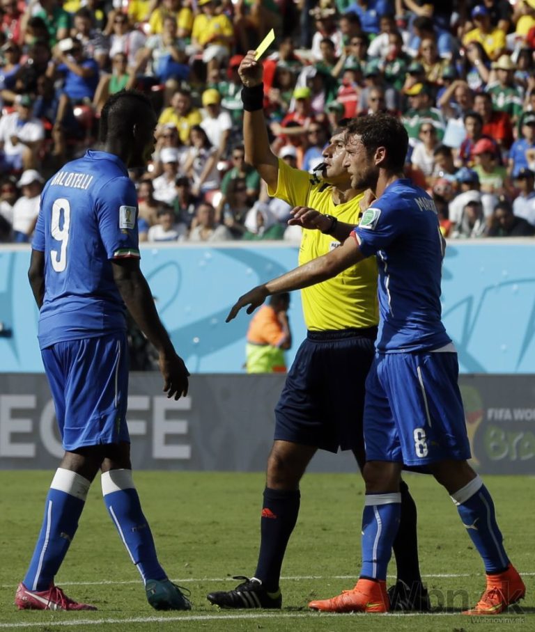Talian Claudio Marchisio, vpravo, sa snaží zakročiť voči zdvihnutej karte na svojho spoluhráča Maria Balotelliho počas piatkového zápasu medzi Kostarikou a Talianskom v D-skupine na štadióne Arena Pernambuco v Recife. Piatkové duely na XX. majstrovstvách sveta vo futbale v Brazílii. Foto: SITA/AP