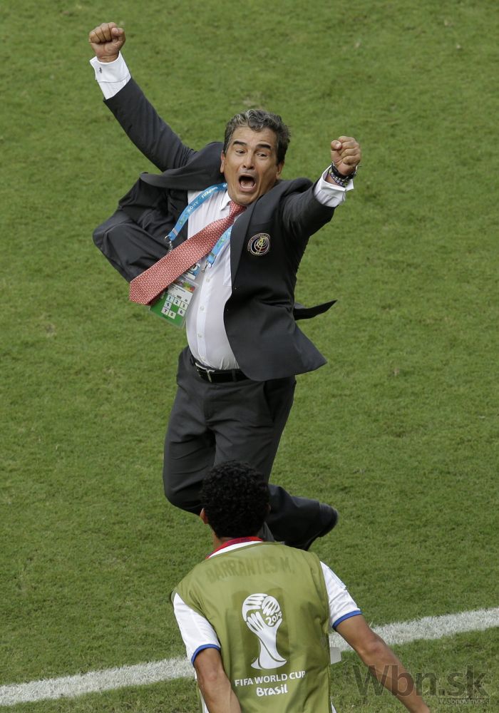 Tréner Kostariky Jorge Luis Pinto sa raduje po víťazstve nad Talianskom v piatkovom zápase D-skupiny na svetovom šampionáte v Brazílii. Foto: SITA/AP