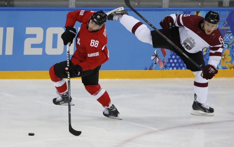 Zľava: Švajčiar Kevin Romy a Lotyš Mārtiņš Karsums počas stredajšieho zápasu v rámci mužského olympijského hokejového turnaja. Foto: SITA/AP