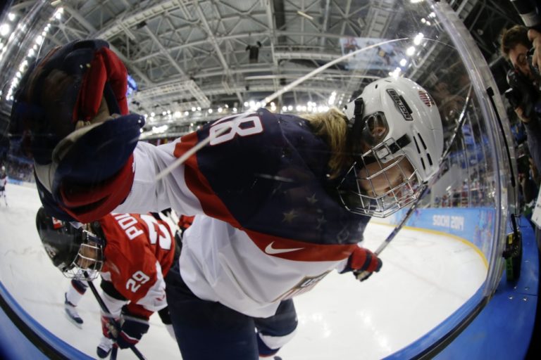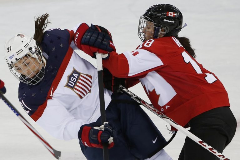 Zľava: Americká hokejistka Hilary Knightová v súboji s Kanaďankou Catherine Wardovou počas stredajšieho zápasu v rámci ženského olympijského turnaja. Foto: SITA/AP