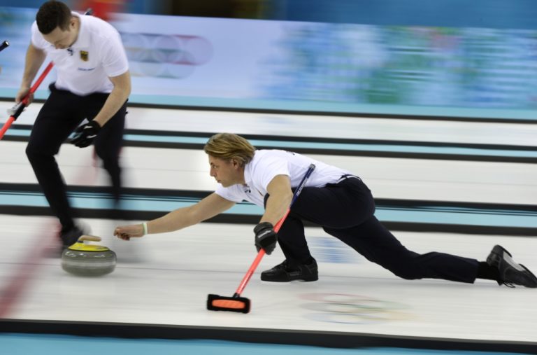 Nemeckí reprezentanti v curlingu počas stredajšieho zápasu na olympijskom turnaji. Foto: SITA/AP