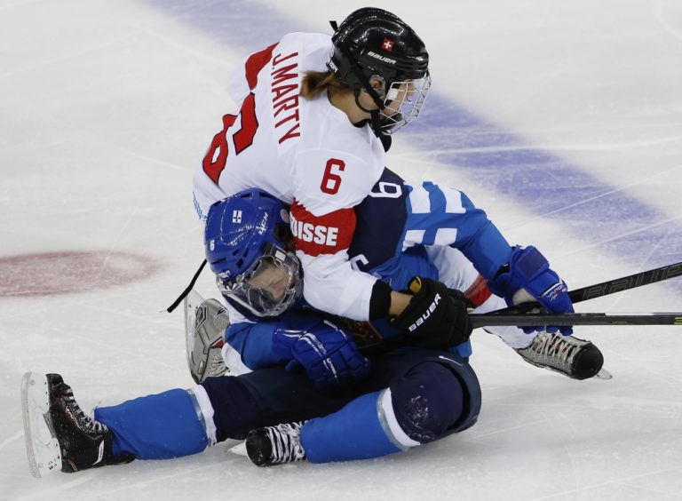 Fínska hokejistka Jenni Hiirikoskiová v súboji so Švajčiarkou Juliou Martyovou počas stredajšieho zápasu ženského olympijského turnaja. Foto: SITA/AP