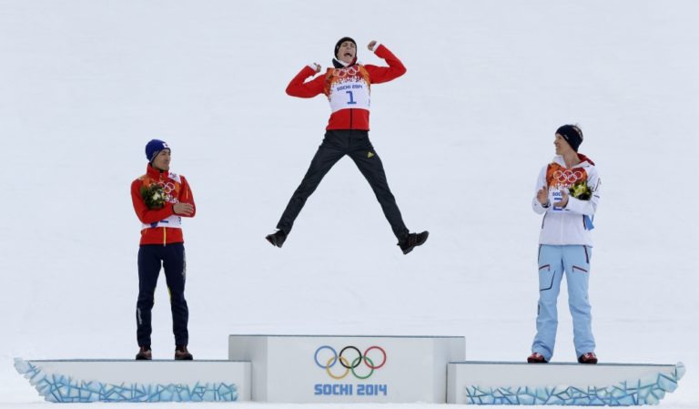 Zľava: Medailisti zo severskej kombinácie - Akito Watabe (striebro), Eric Frenzel (zlato) a Magnus Krog (bronz). Foto: SITA/AP