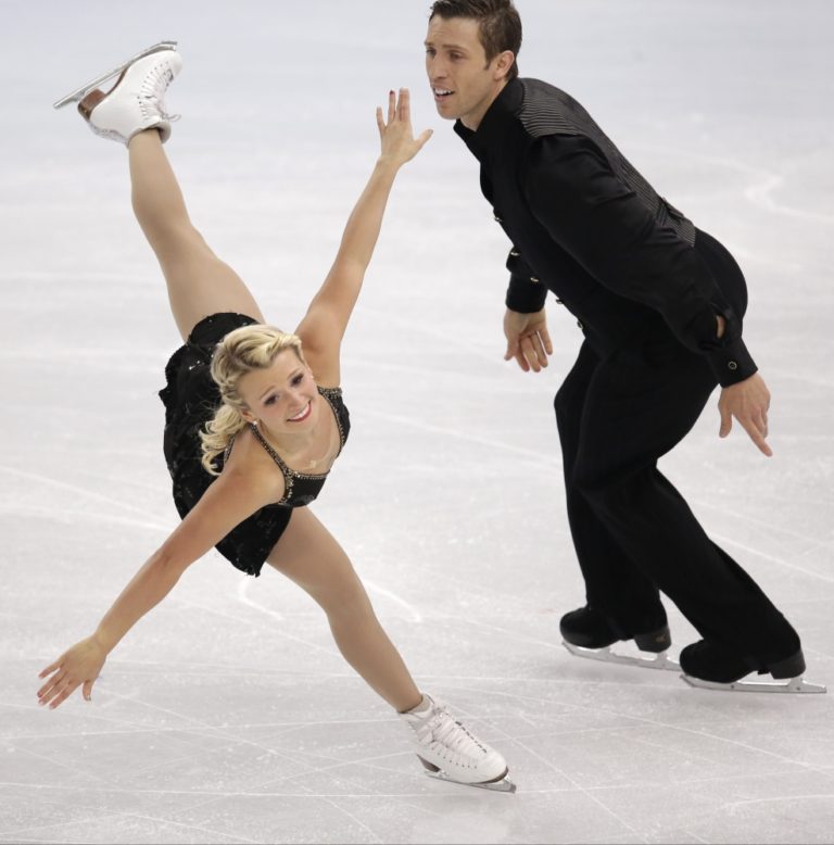 Kirsten Moore-Towersová a Dylan Moscovitch počas stredajšieho súperenia vo voľných jazdách športových dvojíc. Foto: SITA/AP