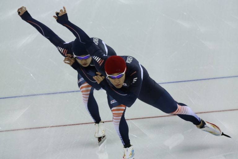 Juhokórejskí rýchlokorčuliari Mo Tae-bum (vpredu) a Kim Tae-yun počas rozjazdy pred pretekmi na 1000 metrov. Foto: SITA/AP