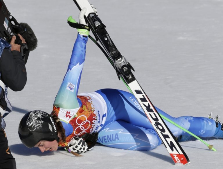 Slovinská lyžiarka Tina Mazeová bozkáva sneh v cieli stredajšieho zjazdu žien, v ktorom spoločne so Švajčiarkou Dominique Gisinovou dosiahli rovnaký čas a získali zlaté medaily. Foto: SITA/AP
