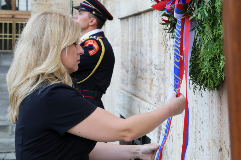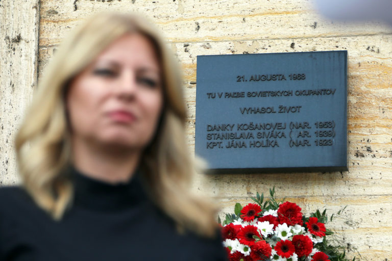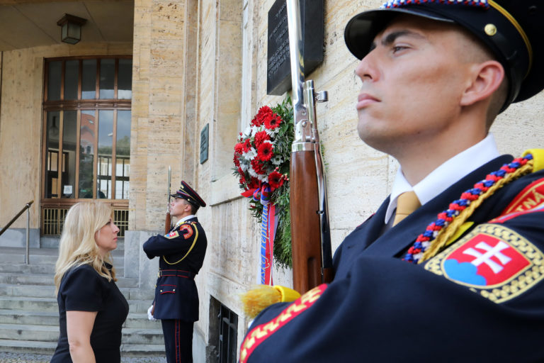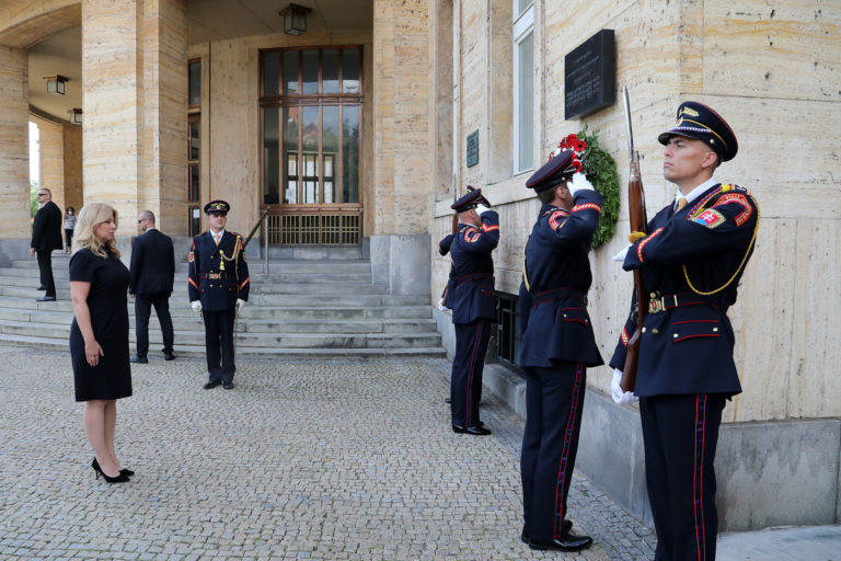 Prezidentka SR Zuzana Čaputová počas kladenia venca pred budovou Univerzity Komenského v Bratislave pri príležitosti 53. výročia okupácie Československa vojskami Varšavskej zmluvy. Bratislava, 21. august 2021. Foto: SITA/Kancelária prezidentky SR