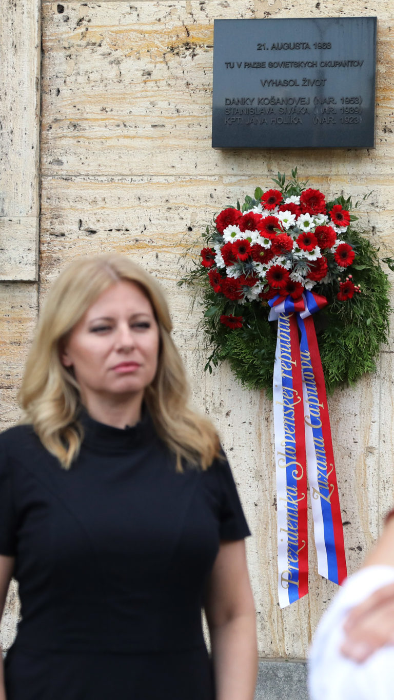 Prezidentka SR Zuzana Čaputová (v popredí) počas kladenia venca pred budovou Univerzity Komenského v Bratislave pri príležitosti 53. výročia okupácie Československa vojskami Varšavskej zmluvy. Bratislava, 21. august 2021. Foto: SITA/Kancelária prezidentky SR