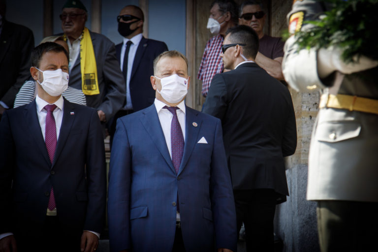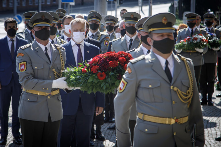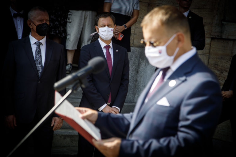 Zľava: Predseda vlády SR Eduard Heger a predseda parlamentu Boris Kollár počas pietnej spomienky na obete okupácie Československa
