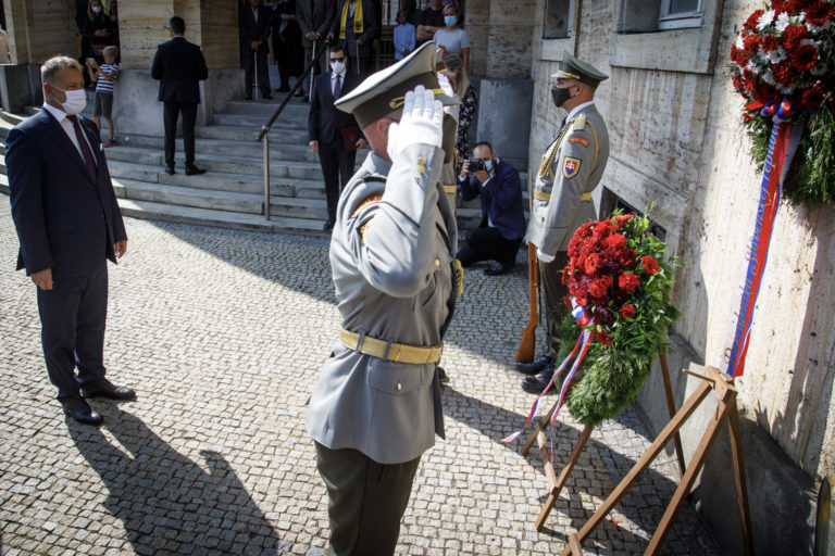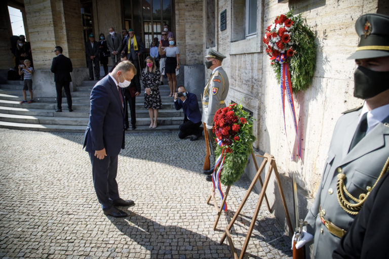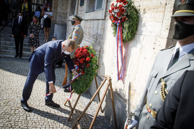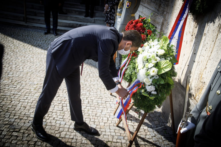 Predseda vlády SR Eduard Heger kladie veniec počas pietnej spomienky na obete okupácie Československa pri pamätnej tabuli na budove Univerzity Komenského. Bratislava, 21. august 2021. Foto: SITA/Branislav Bibel