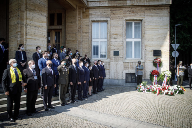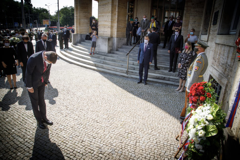 Predseda vlády SR Eduard Heger (uprostred) a predseda parlamentu Boris Kollár (vpravo) počas pietnej spomienky na obete okupácie Československa pri pamätnej tabuli na budove Univerzity Komenského. Bratislava, 21. august 2021. Foto: SITA/Branislav Bibel